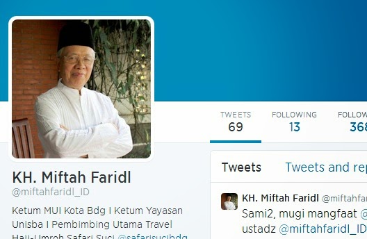 Dalam pantauan BandungAktual, Kamis (7/8), hingga Pkl. 21.00 WIB, akun twitter ulama kelahiran Cianjur tahun 1944 ini sudah difollow 368 Tweeps (pengguna twitter) dan sudah "berkicau" dengan 69 Tweets.