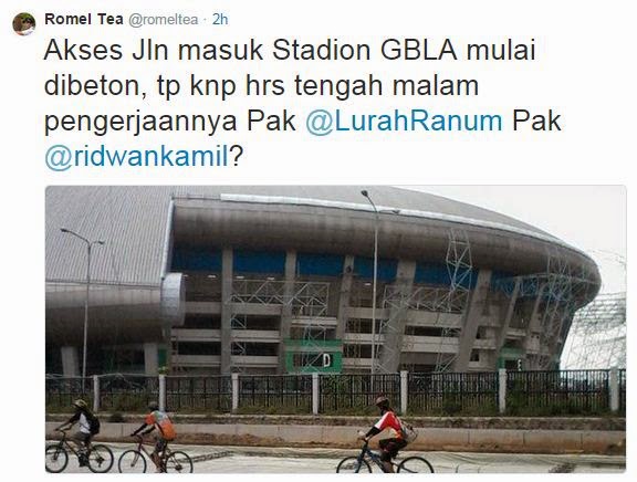 BandungAktual.com -- Warga sekitar Stadion Gelora Bandung Lautan Api (GBLA) Gedebage Bandung memrotes pengerjaan akses jalan masuk stadion dilakukan tengah malam. Pasalnya, suara bising alat berat dan guncangannya mengganggu aktivitias tidur warga.
