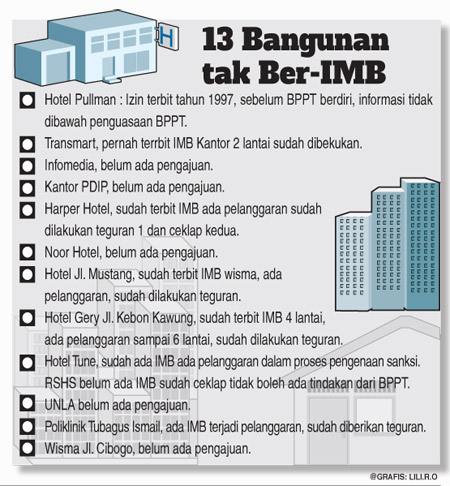 BandungAktual.com -- Sedikitnya 13 gedung di Kota Bandung tidak memiliki izin mendirikan bangunan (IMB) dan melanggar IMB. Sebagian besar berupa hotel dan satu kantor partai politik.