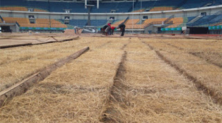 Selama sekitar sebulan, rumput Stadion GBLA ditutupi triplek. Saat PON usai dan triplek dibuka, keadaan rumut layaknya sawah yang baru saja dipanen, mati, dan menguning.