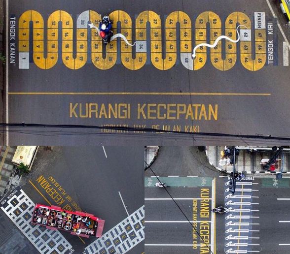 Di Jalan Merdeka, zebra cross berbentuk permainan ular tangga lengkap dengan kotak bernomor dan gambar ular.