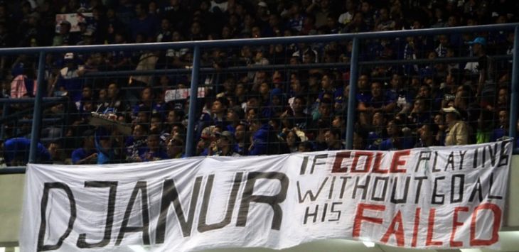 Spanduk bernada sumbang terkait penampilan Cole mulai muncul di Stadion GBLA saat Persib menjamu Persipura Jayapura, Minggu (7/5/2017).