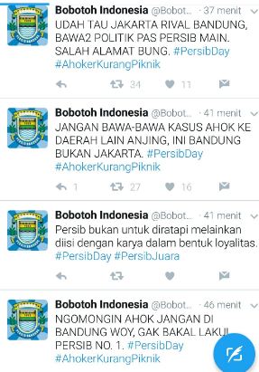 Bobotoh menyatakan amarahnya dengan berbagai kalimat yang berintikan Ahoker jangan mengusik warga Bandung yang identik dengan Persib.