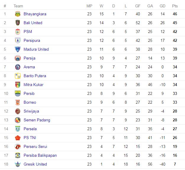Posisi Puncak Klasemen Sementara Liga 1 ditempati Bali United dengan 44 poin dari 22 laga. Bhayangkaa FC di posisi kedua klasemen dengan 43 poin dan Persipura Jayapura di urutan ketiga dengan 42 poin.