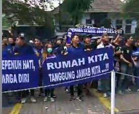 Mereka yang berjumlah puluhan orang berorasi dengan membawa spanduk sebagai bentuk ungkapan mereka, seperti "Bermain dengan sepenuh hati demi sebuah harga diri" dan "Rumah kita tanggung jawab kita".