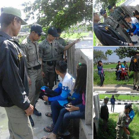 "Monitoring rutin sikon kamtibmas di sekitaran stadion GBLA, dan pasangan remaja yg tengah asyiiiik berduaan di tempat sepi diminta segera meninggalkan tempat," tulisnya plus foto-foto hasil razia Linmas.