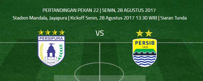 Dirilis laman resmi Liga 1 Indonesia, laga Persipura vs Persib Bandung di Stadion Mandala, Jayapura, Kickoff Senin 28 Agustus 2017 Pkl 13:30 WIB.
