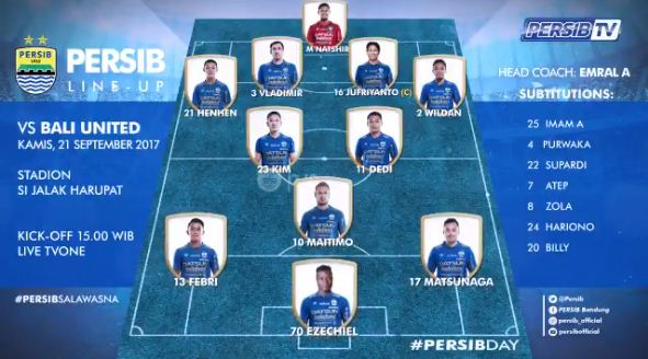 Starting XI #PERSIB (vs Bali United)#PERSIBday #PERSIBsalawasna #PERSIBLive #GoJekTravelokaLiga1 pic.twitter.com/qQD9PJji91— PERSIB (@persib) September 21, 2017