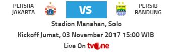 Pertandingan bertajuk El Clasico Indonesia akan tersaji pada pertandingan pekan ke-33 Liga 1 antara Persija Jakarta vs Persib Bandung di Stadion Manahan, Solo, Jumat 3 November 2017, Pkl 15.00 WIB (Siaran Langsung tvOne).