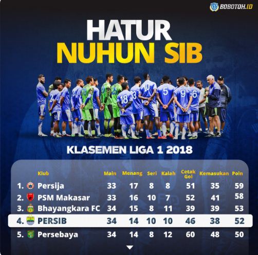 Persib harus puas finis di posisi empat klasemen akhir Liga 1 2018, dengan koleksi 52 poin --hasil 14 kali menang, 10 kali imbang, dan 10 kali kalah.