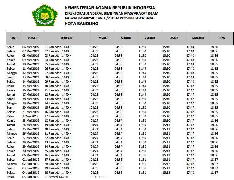 Berikut ini Jadwal Imsakiyah Puasa Ramadhan Ramadhan 1440 H / 2019 M untuk Kota Bandung dan sekitarnya, resmi dari Kementerian Agama RI.Jadwal Imsakiyah Puasa Ramadhan 1440 H / 2019 M untuk kota atau wilayah lainnya di Indonesia bisa dilihat di laman Bimas Islam Kemenag RI.
