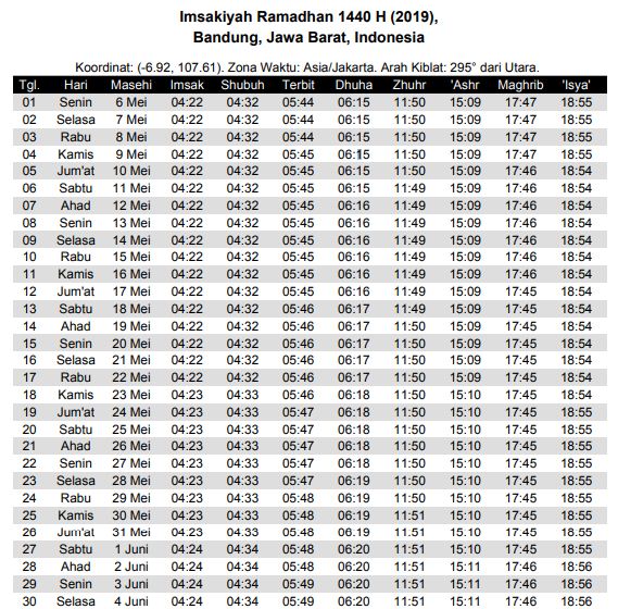Jadwal Imsakiyah Puasa Ramadhan 1440 H / 2019 M juga bisa didapatkan di laman Al Habib Info, sebagaimana jadwal imsakiyah untuk Kota Bandung berikut ini.