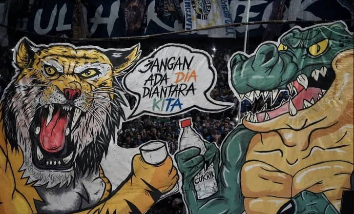 Tulisan yang ada di antara gambar harimau (simbol Persib Bandung) dan buaya (Persebaya) itu, selain sangat kreatif, juga cukup menarik perhatian. Pasalnya, kata "DIA" dalam tulisan tersebut diberi warna khas yang identik dengan tim rival kedua tim.