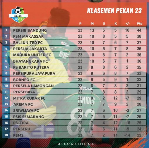Saat ini Persib kokoh di puncak klasemen Liga 1 dengan 44 poin atau unggul 6 poin atas PSM Makassar yang ada di posisi kedua dan terpaut 5 poin atas Bali United di peringkat ketiga.