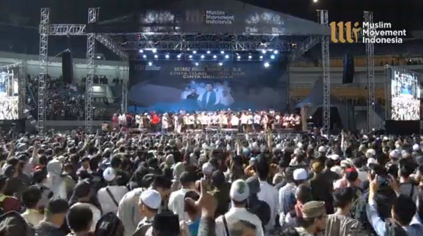Awalnya, saat Ustaz Abdul Somad menaiki panggung para jemaah yang berada di lapangan stadion masih berdiri. Namun, seiring Ustaz Abdul Somad memulai tausiah, semua jemaah pun duduk meski lapangan basah.