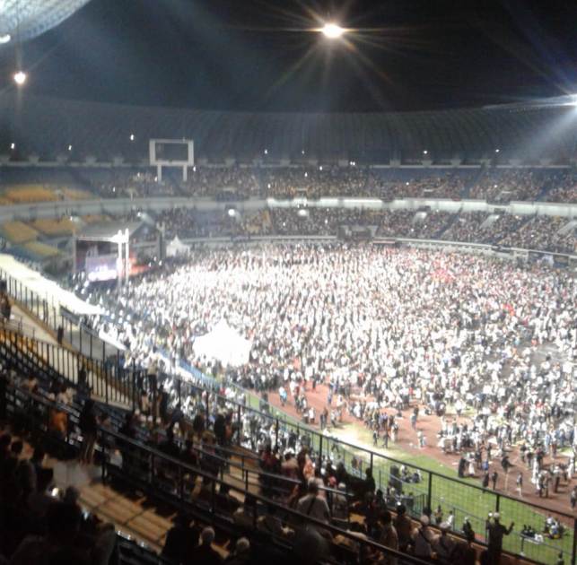 Jamaah memenuh lapangan stadion dan tribun penonton. Sempat diguyur hujan sebelum UAS tampil, ceramah dimulai ketika hujan reda.