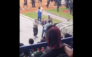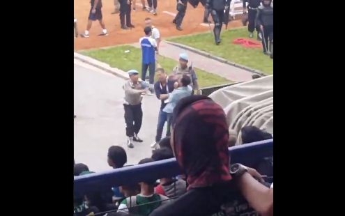 Para penonton yang berlari ke tengah lapangan langsung diamankan oleh pihak keamanan dan dipukul mundur untuk keluar dari stadion.