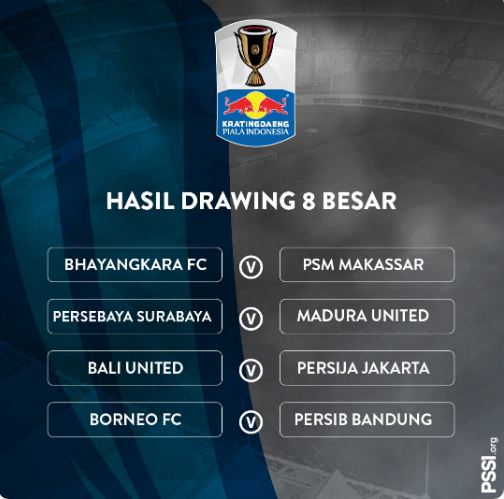 Hasil drawing babak 8 besar Kratingdaeng Piala Indonesia.#PSSINow #KratingdaengPialaIndonesia pic.twitter.com/uWU152jaMs— PSSI (@PSSI) April 15, 2019