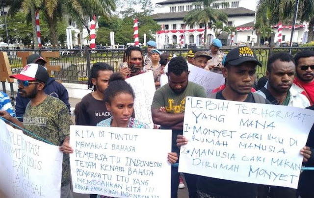 Massa aksi kemudian membentangkan spanduk yang diantaranya bertuliskan "Kita Dituntut Menggunakan Bahasa Indonesia sebagai Bahasa Pemersatu. Tetapi mengapa bahasa pemersatu itu yang memecahkan kita? apakah Papua bukan bagian dari Indonesia?" "Lebih terhormat mana Monyet Cari Ilmu di tanah Manusia atau Manusia Mencari Makan di Tanah Monyet?" "Stop Rasis".*