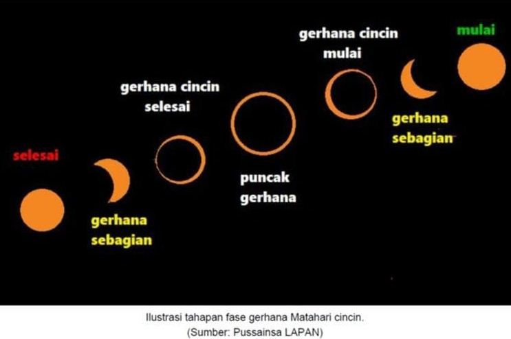 Berdasarkan data yang ada, kata dia, gerhana matahari cincin di Kota Bandung akan berlangsung selama 3 jam 38 menit. Dengan awal gerhana terjadi pada pukul 10.46 WIB, puncak gerhana pukul 12.38 WIB dan berakhir pada 14.24 WIB.