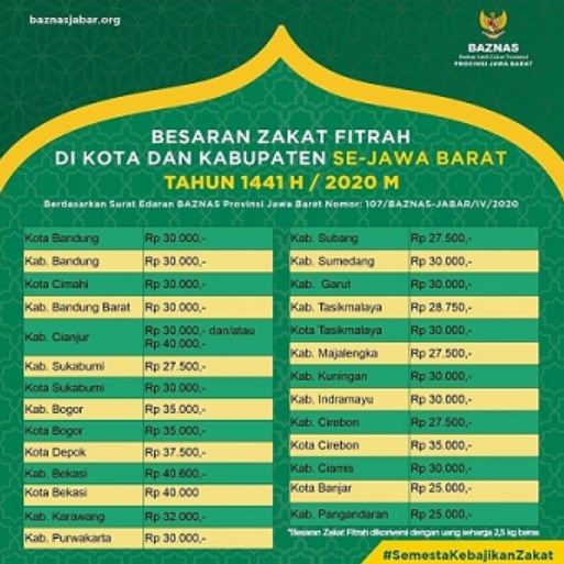 Badan Amil Zakat Nasional (Baznas) Provinsi Jawa Barat resmi menetapkan besaran zakat fitrah tahun 1441 H/ 2020 M di kota/kabupaten Se-Jawa Barat berdasarkan surat edaran Nomor: 107/BAZNAS-JABAR/IV/2020.